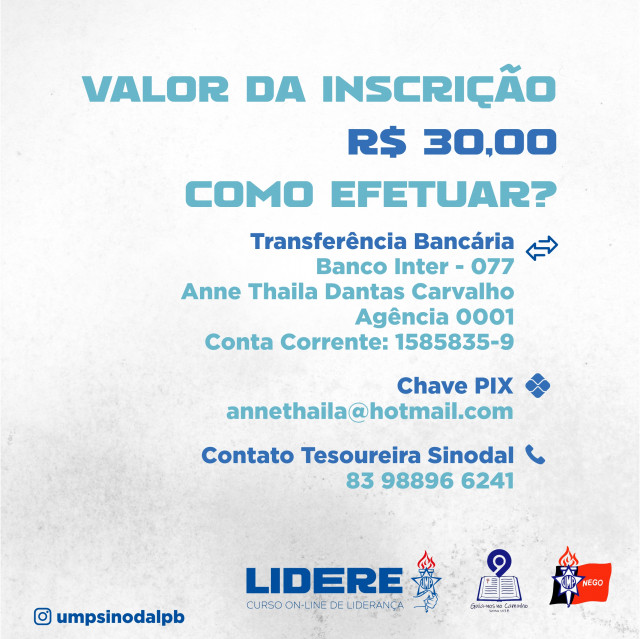 Para saber mais informações sobre aulas, formas de pagamento e efetuar sua inscrição clique no link linktr.ee/umpsinodalpb e acompanhe as redes sociais da CSM-PB (https://www.instagram.com/umpsinodalpb/).