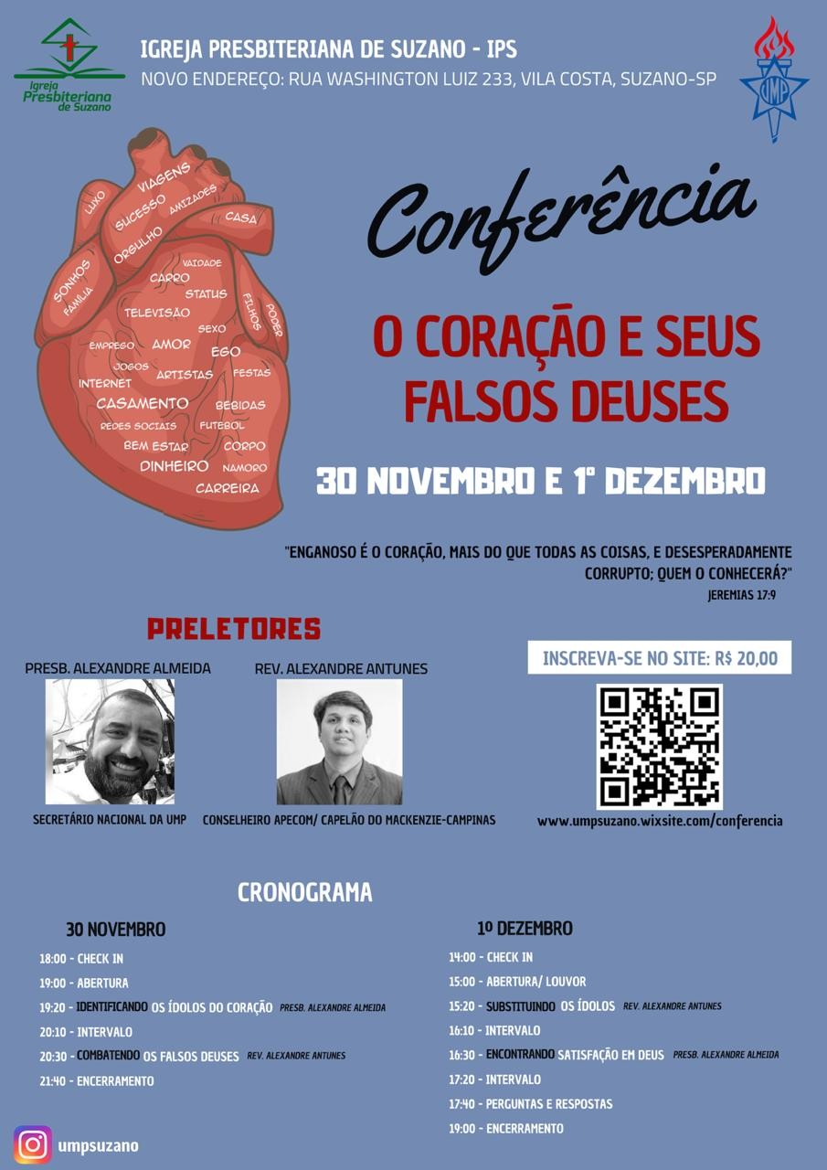 Pensando nisto a UMP de Suzano convida todos para a conferência com o propósito de auxiliar na identificação desses ídolos, para combatê-los e substituí-los à fim de encontrarmos plena satisfação no verdadeiro Deus.