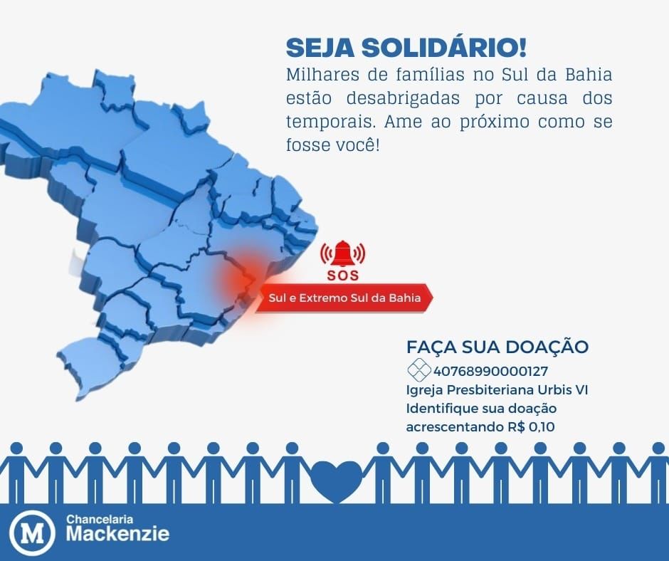 A Chancelaria do Instituto Presbiteriano Mackenzie compartilha o sofrimento de milhares de famílias no sul da Bahia atingidas pelos temporais que deixaram muitos desabrigados.